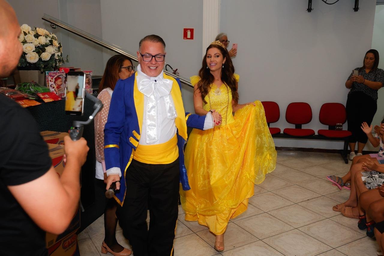 Maria Melilo, caracterizada como a princesa Bela, e Dicesar, fantasiado de Fera, recriaram o clássico conto “A Bela e a Fera”, levando encantamento, alegria e muita emoção aos presentes. A ação, que Maria realiza anualmente desde 2011, teve como principal objetivo espalhar amor, promover momentos de felicidade e reforçar a importância do carinho e da atenção com as crianças em situação de vulnerabilidade.