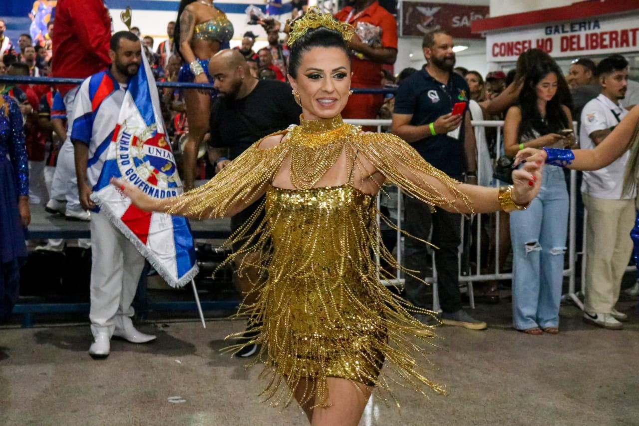 Para a ocasião especial, Tatiana apostou no dourado, remetendo ao sol e ao “amanhecer na ilha”, alusão também à posição de desfile da escola, que fechará a primeira noite dos desfiles da Série Ouro.